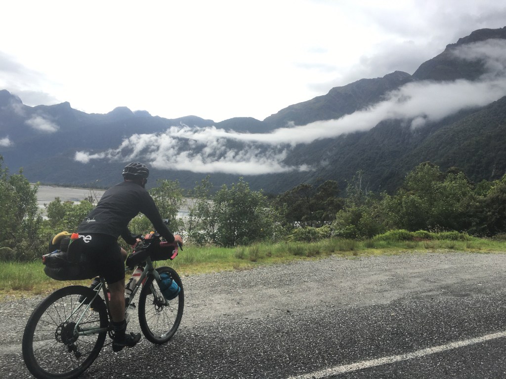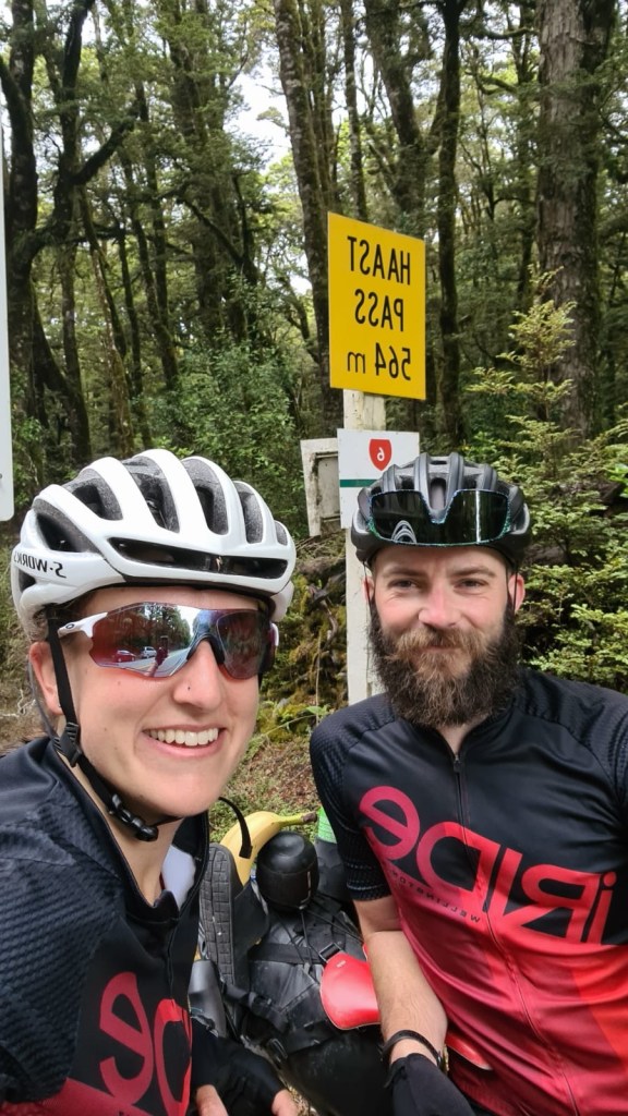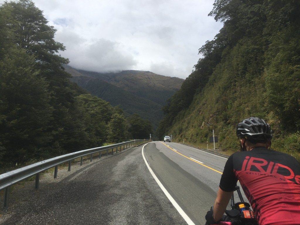 We were at about 55km for the day at this point, I’m sure the book said the climb was at 60, so off we tootle, thinking the hill is to come soon, around the corner my bike computer beeps at me and says hill 2/4. Hmmmmm, maybe this is the hill… the road gets steep, this is the hill. We pass over Haast Pass bridge, you will know it if you’ve ever driven over it, the most powerful river crashing through rocks and it’s bright blue! Sadly we didn’t get a picture as cars / hill / trying not to die by angry cars killing us after one had already hit me with its wing mirror but use your imagination. It’s pretty epic.